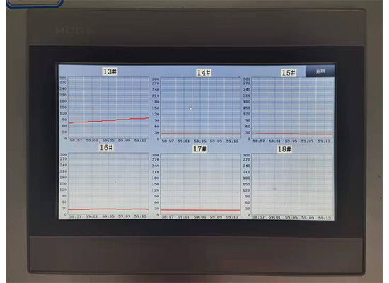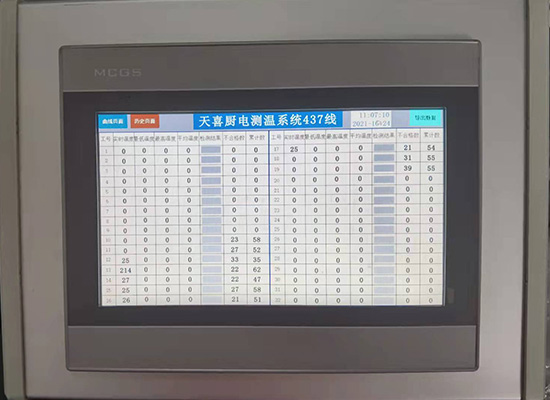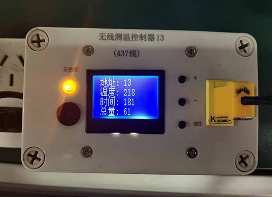 4、判断产品温度是否合格采用声光报警,合格亮绿灯,不合格亮红灯,数据通过无线传输记录在主机上,主机上可以翻看历史数据观看每台分机所生产的数据。
